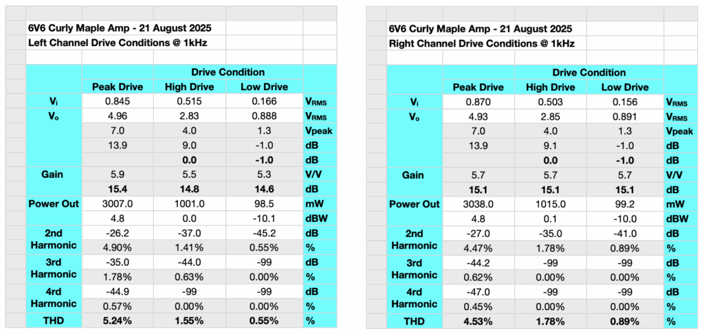 My office is on a different floor than my main living space. As such, I have to be careful how often I climb the stairs in during the day. I really didn’t realize how many times I went up and down stairs in a typical day until I sprained this ankle. So working on the project page has been slow going. But just as an assurance that I have been at work, here are the power and distortion numbers with the old style 6V6Gs in the amplifier.
